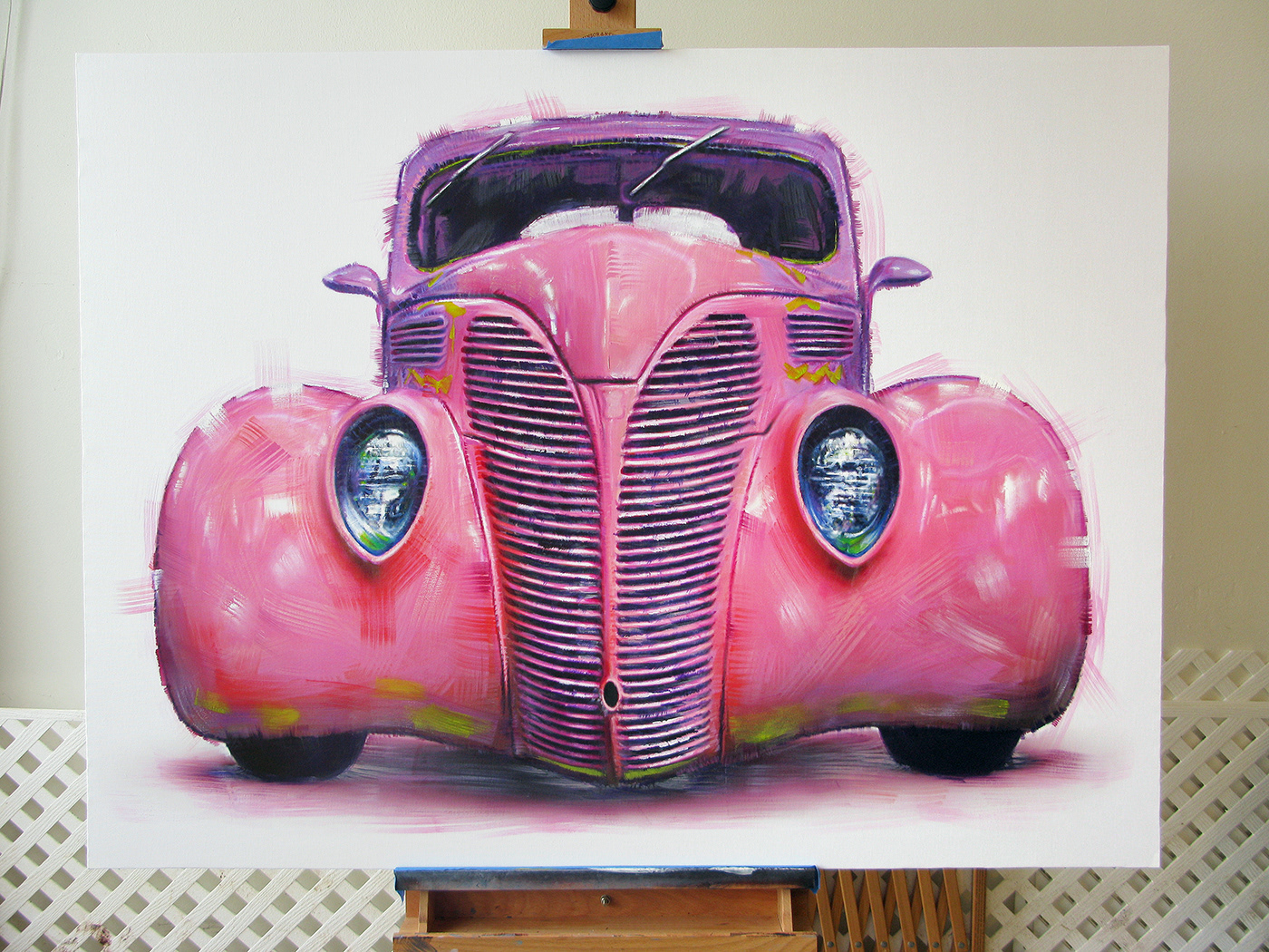 The 1938 Ford Coupe was part of a series of oil paintings that I created for the exhibit entitled, 'Urban Hue' in the DOMA Gallery at BYU–Hawaii. The painting is 48 x 36 inches and features a front view of the classic car showcasing the grill.