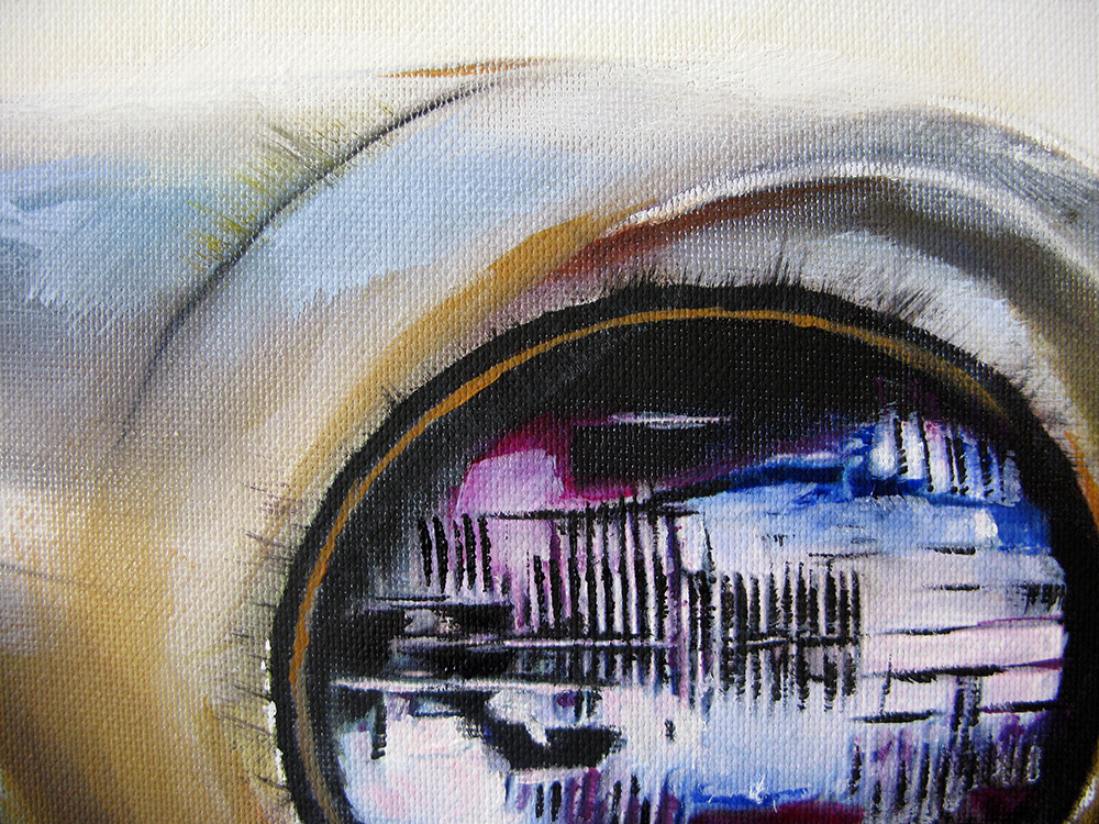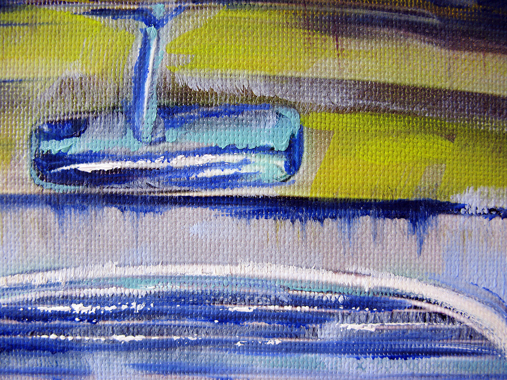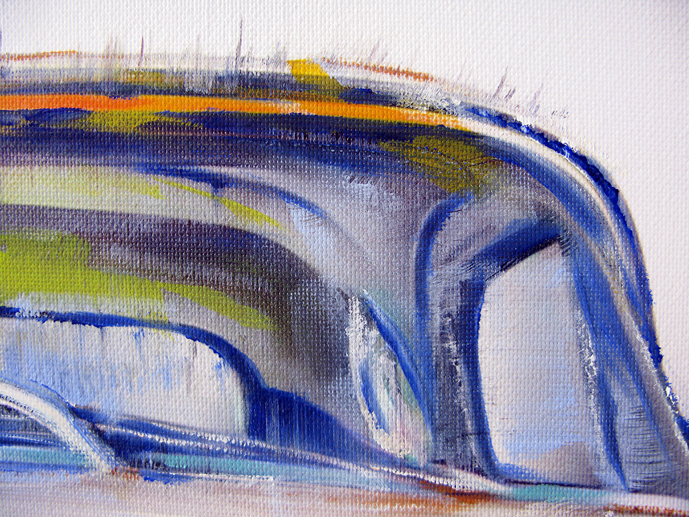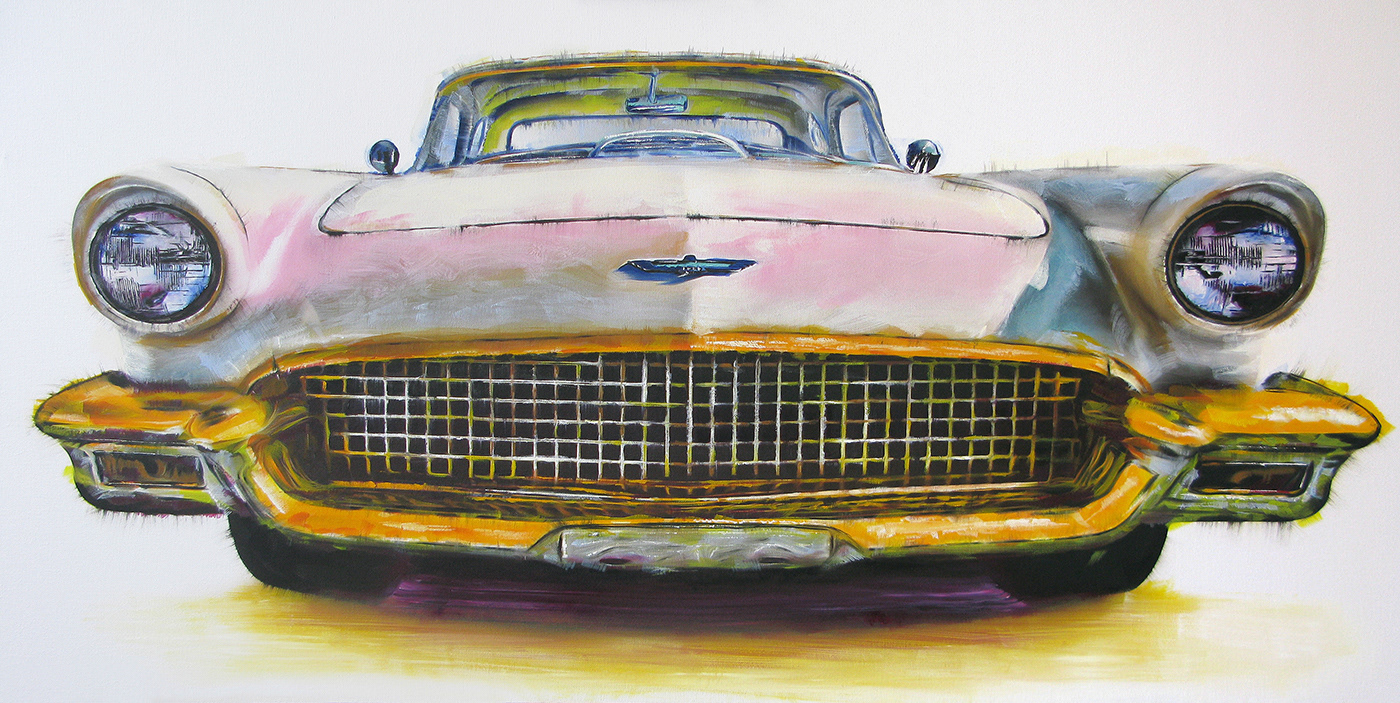 The 1957 Thunderbird was part of a series of oil paintings that I created for the exhibit entitled, 'Urban Hue' in the DOMA Gallery at BYU–Hawaii. The painting is 48 x 24 inches and features a front view of the classic car showcasing the grill.