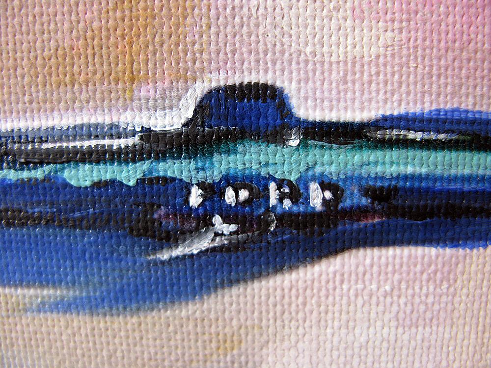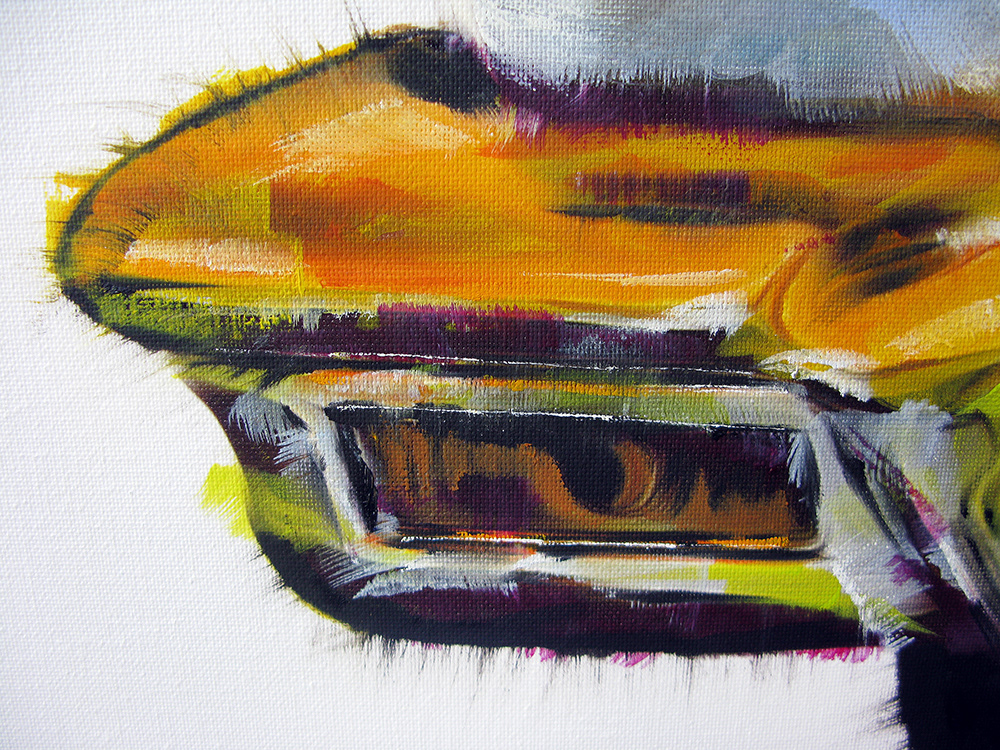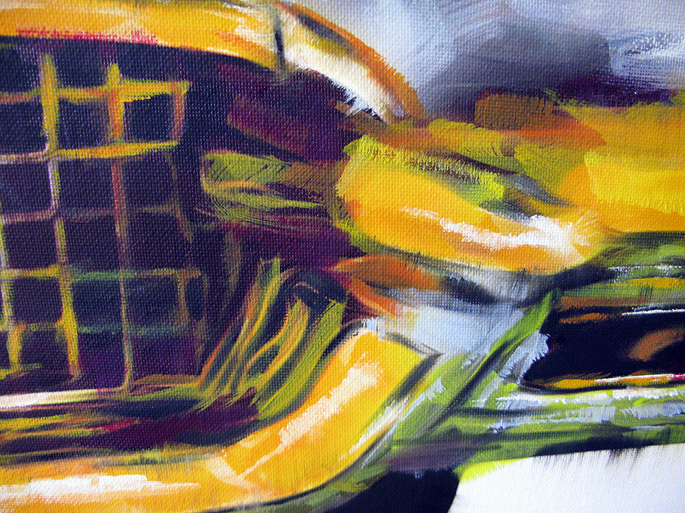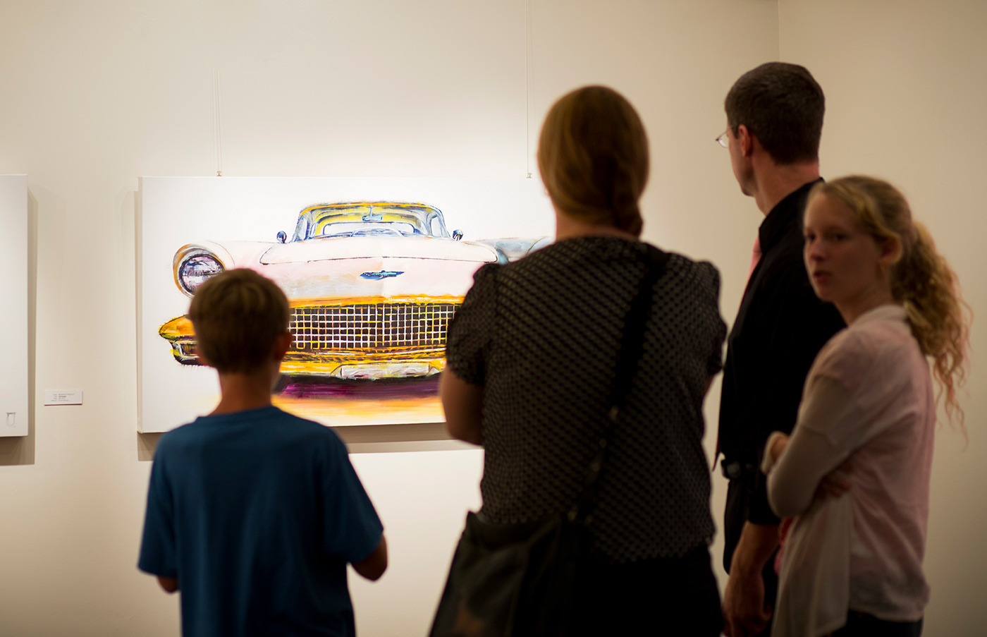 The 1957 Thunderbird was part of a series of oil paintings that I created for the exhibit entitled, 'Urban Hue' in the DOMA Gallery at BYU–Hawaii. The painting is 48 x 24 inches and features a front view of the classic car showcasing the grill.
