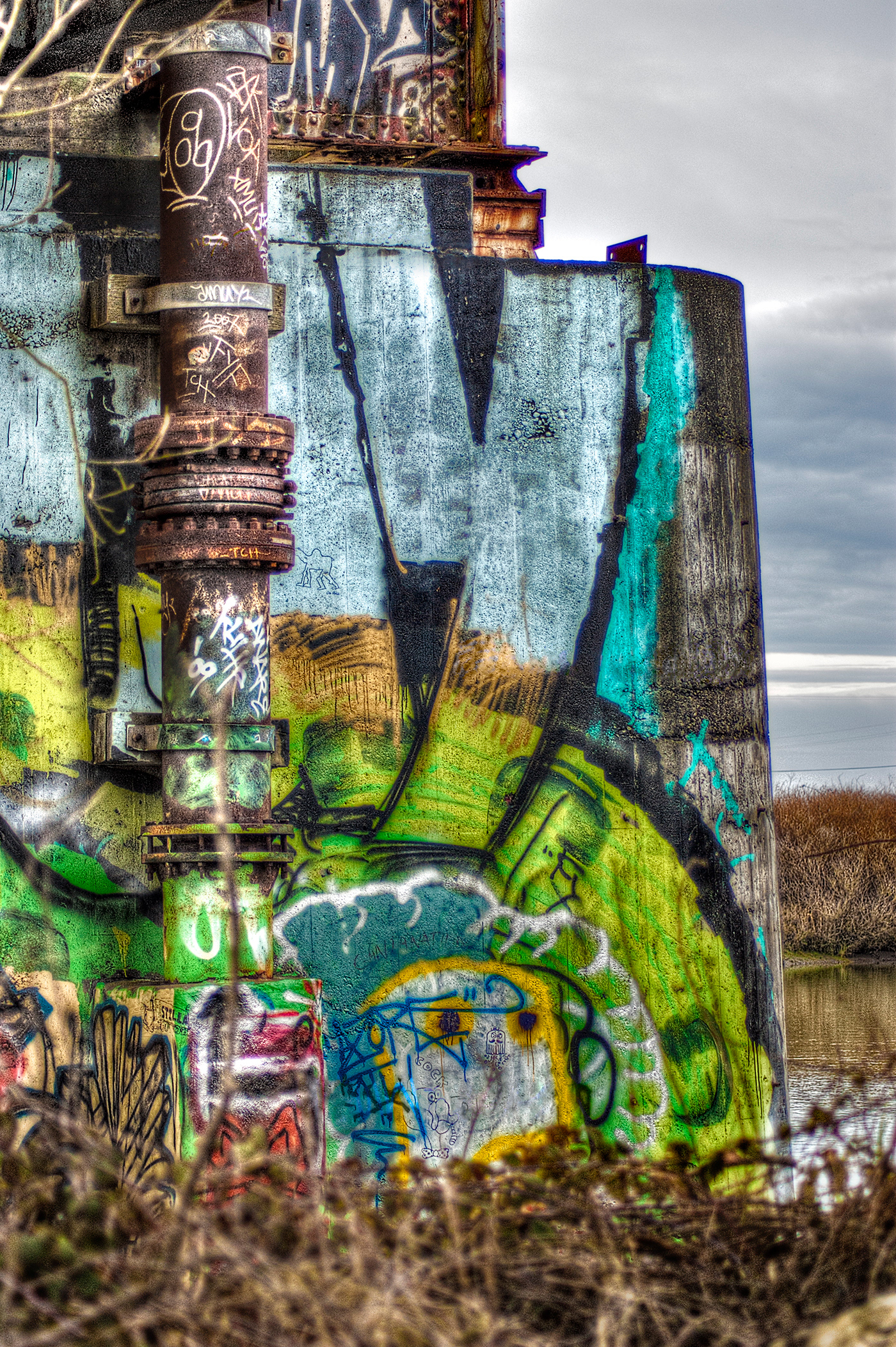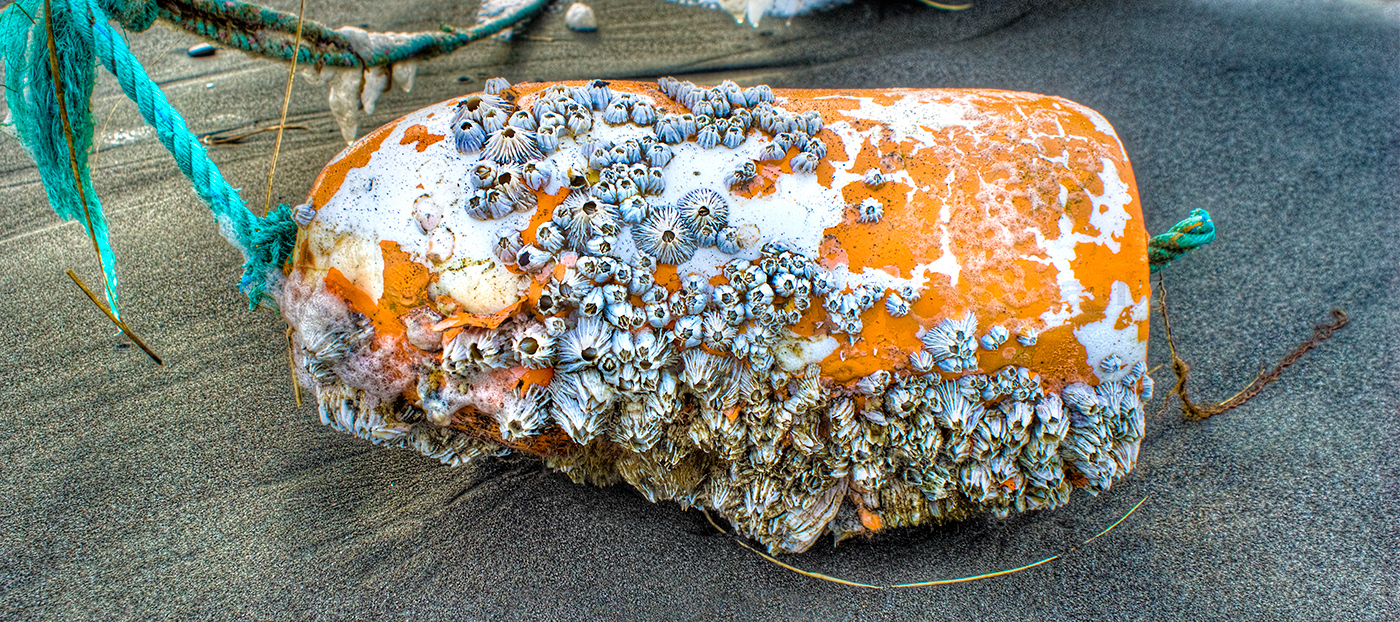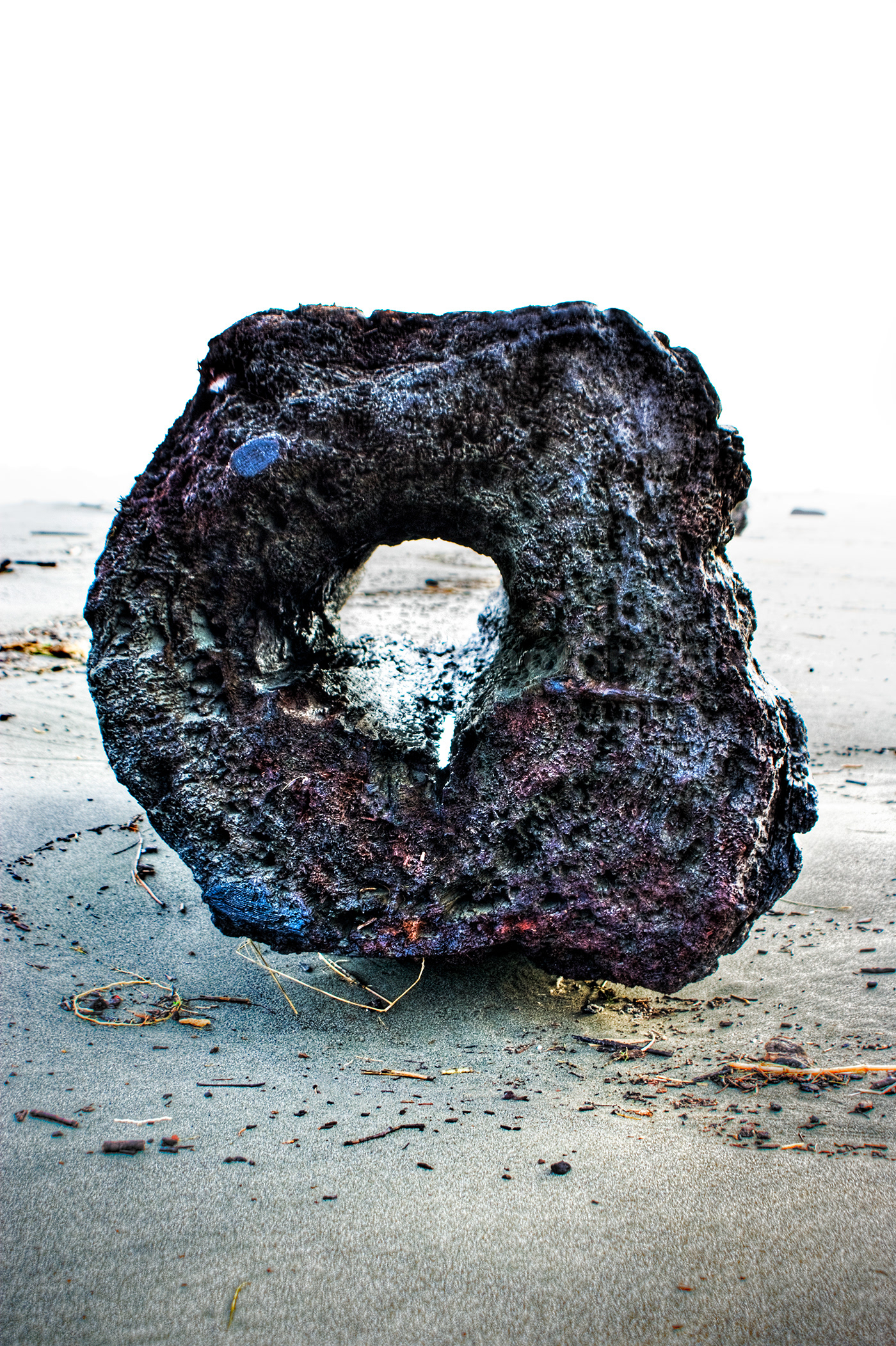 These photographs utilize HDR exposures of miscellaneous detritus; A fire-hollowed redwood drift log, a barnacled buoy, pipe hardware, & graffiti.