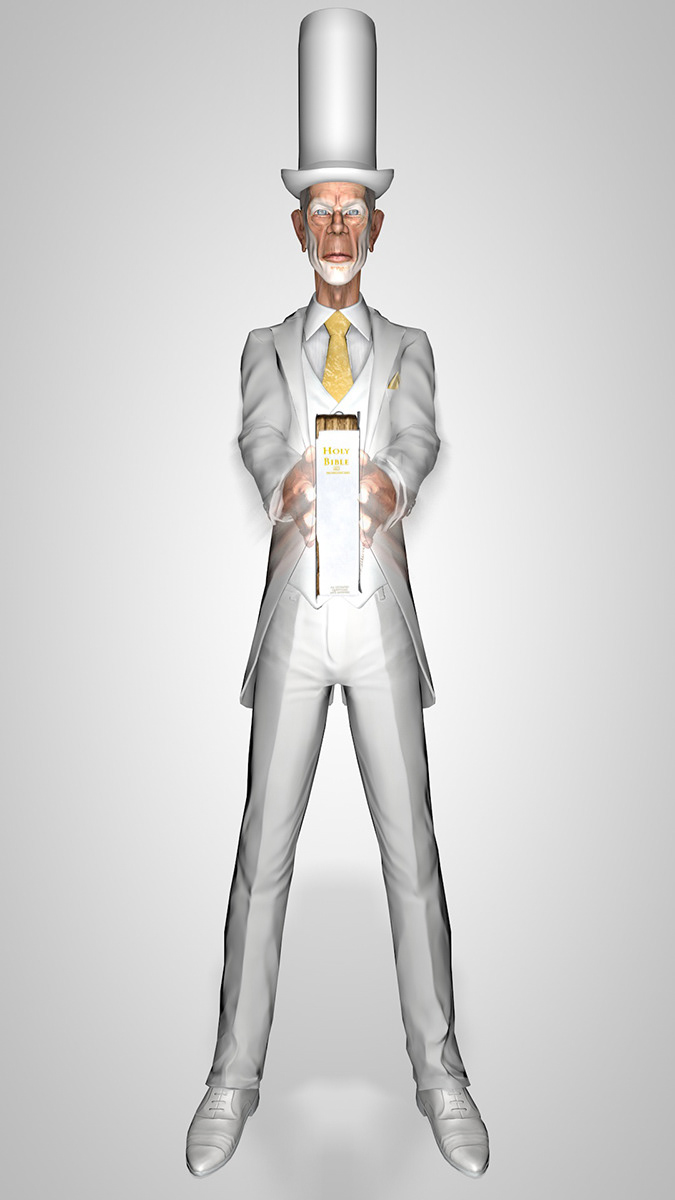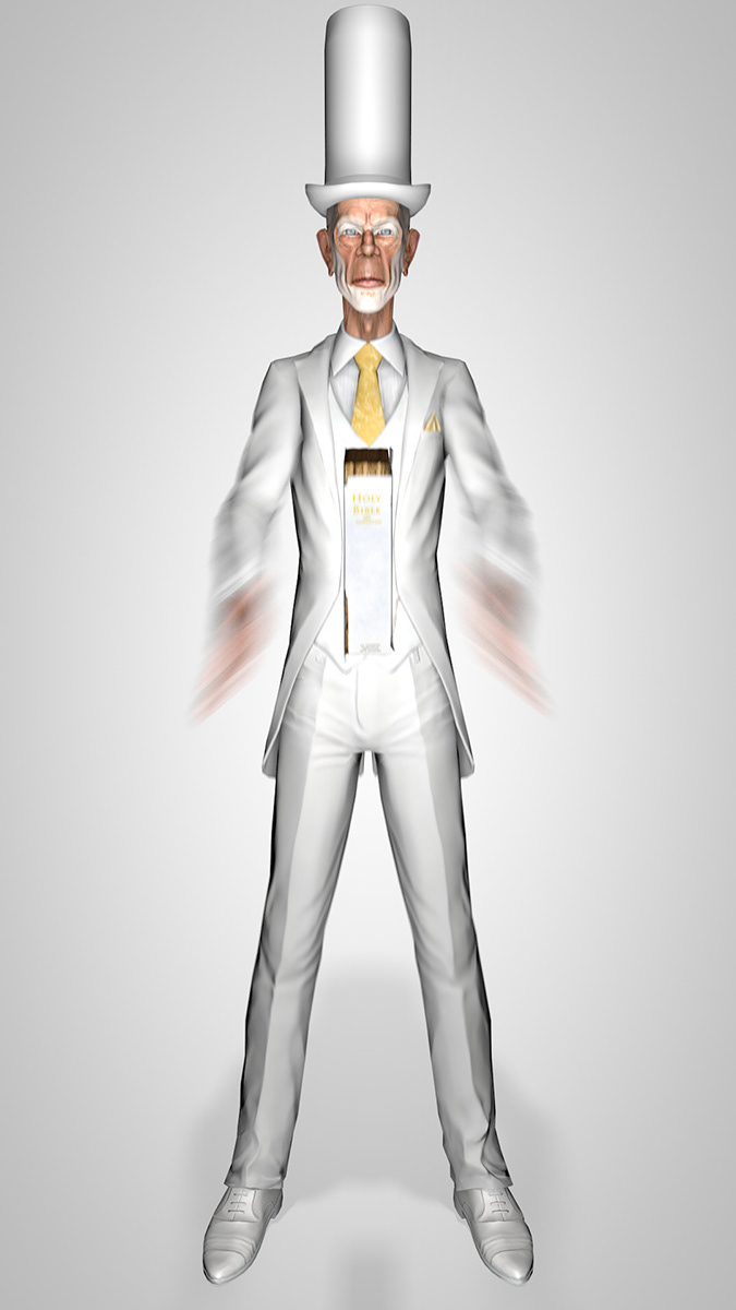 Magnetist is a 24 second motion graphic loop created from composited 2D and 3D animation with audio. The piece depicts a 19th century religious healer dressed in formal wear including a suit, vest, top hat and pocket watch. In slow motion, the healer slaps a Bible repeatedly as it levitates and spins in the air. Every time the Bible is struck, the healer exchanges his white raiment in a vacant white backdrop for dark apparel amid a black void. At every interval, a digitized monotone voice repeats two warning passages of scripture; ‘Like a wolf in sheep’s clothing”, and “Like a thief in the night.” (Mathew 7:15, 1 Thessalonians 5:2) The verses act as a series of preliminary suggestive instructions as in hypnotic induction. In the 18th century, Franz Friedrich Anton Mesmer, gave the name mesmerism or animal magnetism to what he believed to be an invisible natural force exerted by animals that could have physical effects, including healing. Hypnotism, a designation coined by the Scottish surgeon, James Braid, was in response to an (1841) exhibition of ‘animal magnetism’, by Charles Lafontaine, in Manchester, England. The theory attracted numerous followers in Europe and the United States and was popular into the 19th century. Practitioners were often known as magnetizers. For about 75 years it was an important specialty in medicine and created a venue for spiritual healing. During the Romantic period, mesmerism produced enthusiasm and inspired horror in the spiritual and religious context. Some magnetists advertised their practices by stressing the spiritual benefits and were able to gather a good clientele from among the religiously zealous population. Often they attempted this with a ‘laying on of hands’. Reported effects included feelings of intense heat, trembling, trances, and seizures. Many researchers, among them Protestants and spiritists, claimed that Jesus was the greatest of all magnetizers, and that the source of his miracles was animal magnetism. Magnetist was on display from OCT 6 - DEC 3, 2016 at the Woodbury Art Museum.