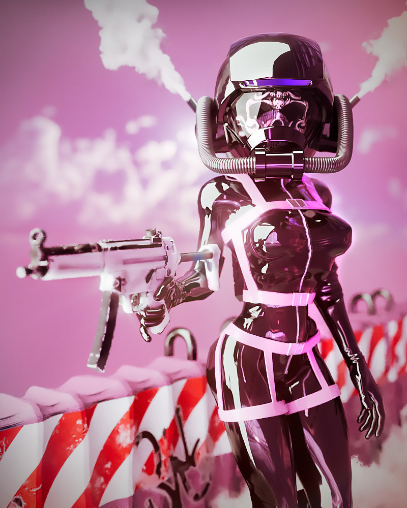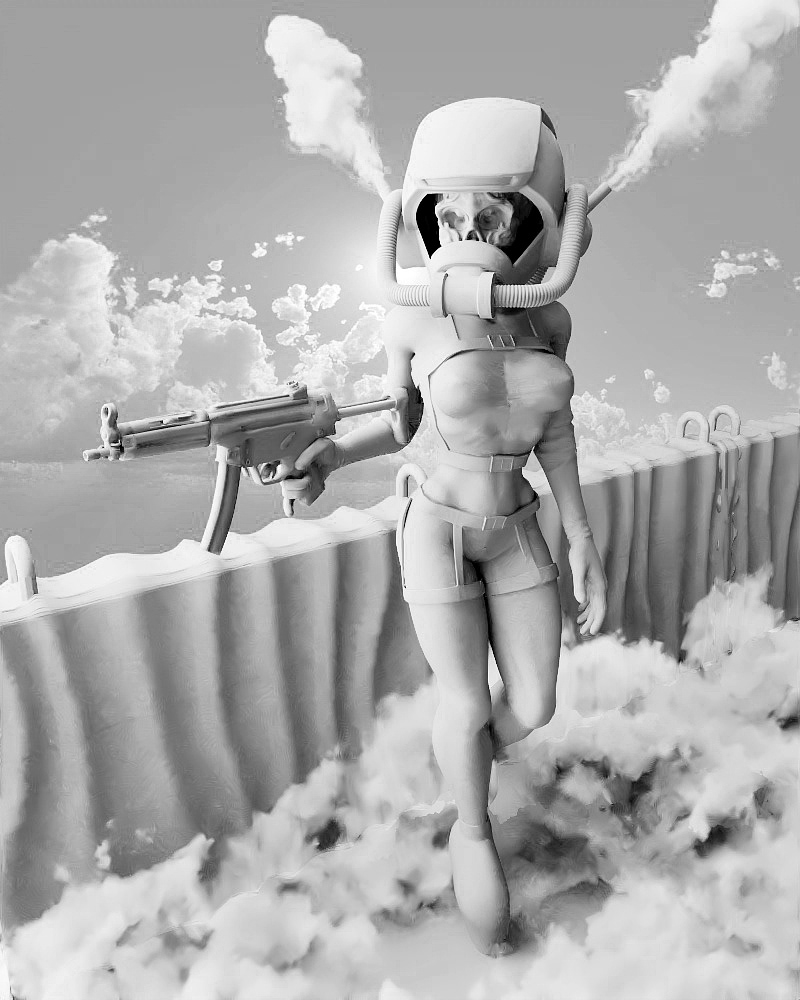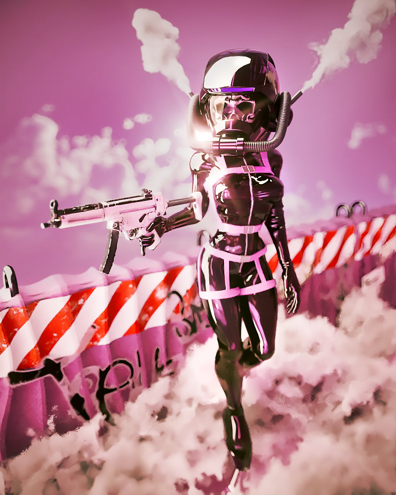 The Policing Heaven 3D rendering was made using a rigged character and VDBs in Cinema4D, Redshift, and Substance Painter.