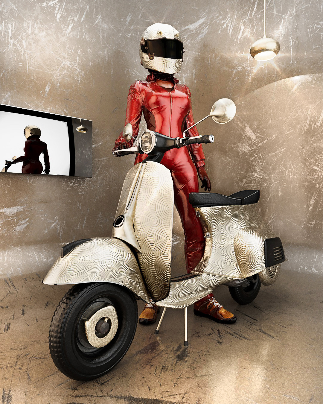The Racy Vespa 3D rendering was made using a rigged character in Cinema4D, Redshift, and Substance Painter.