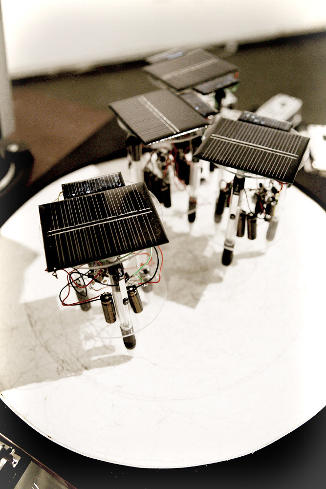 This arrangement of solar powered drawing robots was created to critique the automation and mass production of society. The drawing robots are simple circuits powered by light created to interact with each other and draw a picture thus removing the need for the hand of a human in the creation of art. The installation was on display at the Swell Gallery in San Francisco.