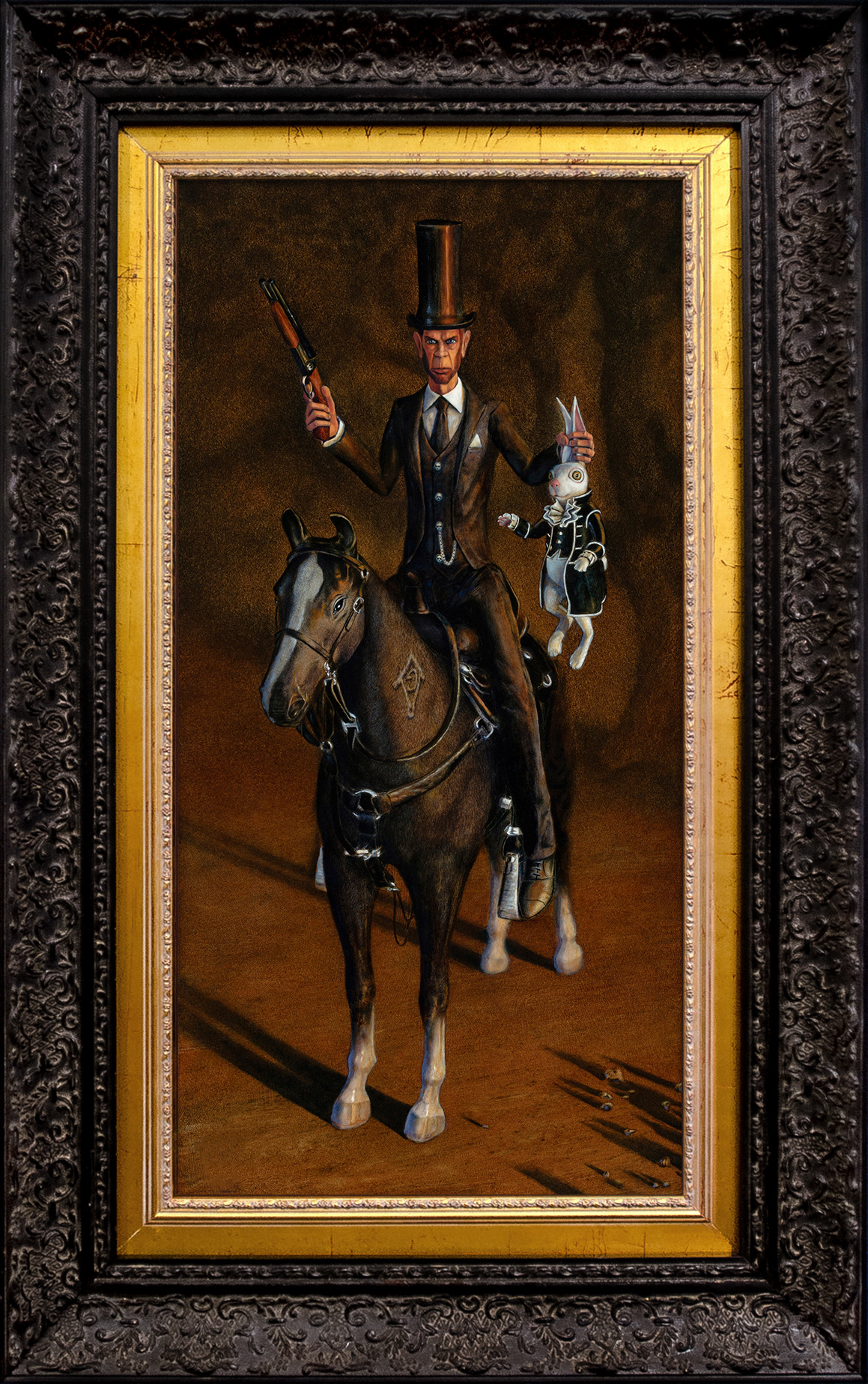 A nineteenth century chap is posed for a hunting portrait wearing a three-piece suit and top hat. Seated in the saddle of his black horse that is branded with the mark of the ‘Crazy Masons’ he holds a ‘Lupara’ sawed-off double-barreled shotgun in his right hand. In his left hand he grasps ahold of the White Rabbit who has been captured but is still alive. The White Rabbit who reaches out for the man’s pocket watch also dons a suit and Victorian jabot. Time for Tea was on display at the Woodbury Art Museum from October 2 - December 8, 2018 and in the Springville Museum of Arts 95th annual Spring Salon April 24 - July 6, 2019.