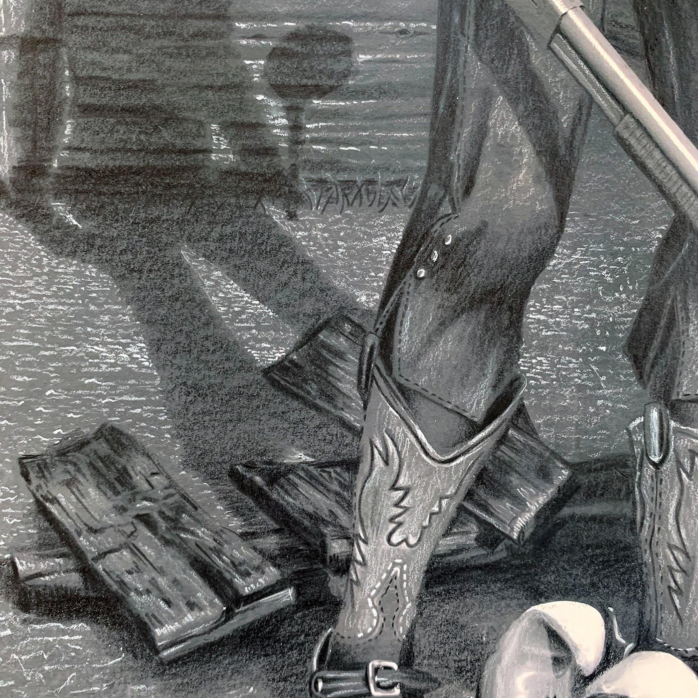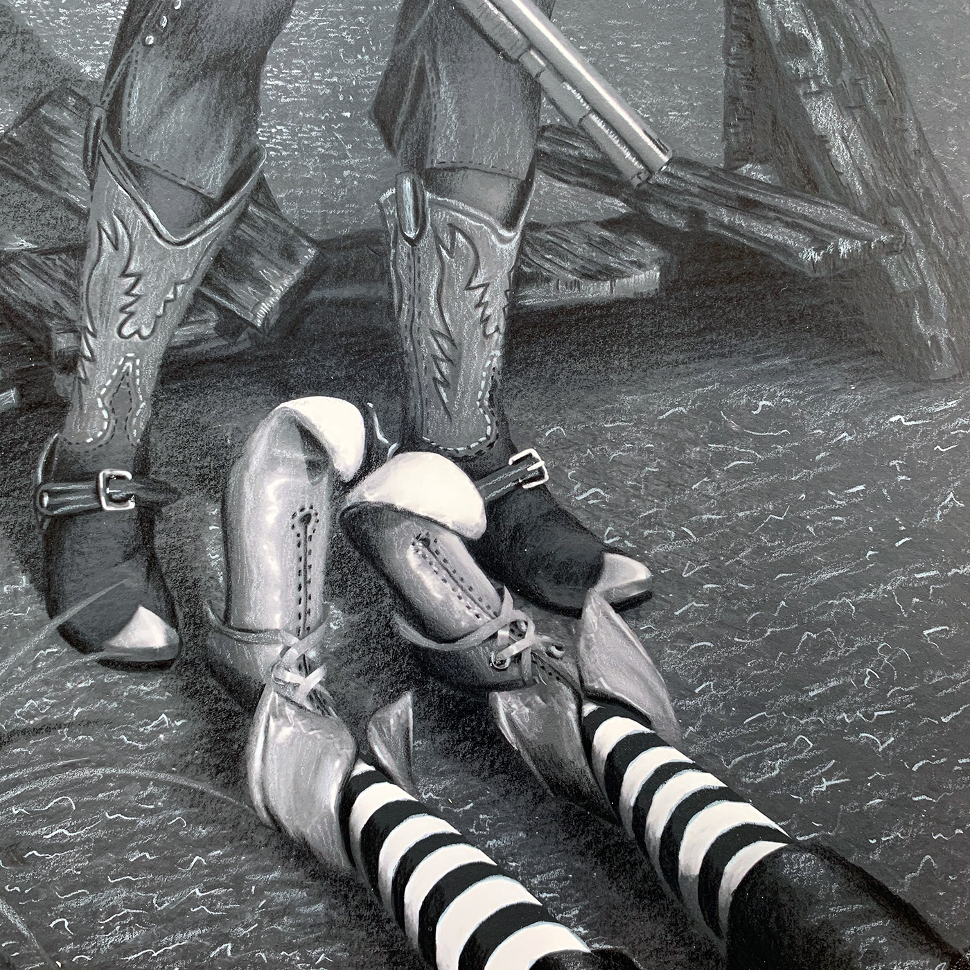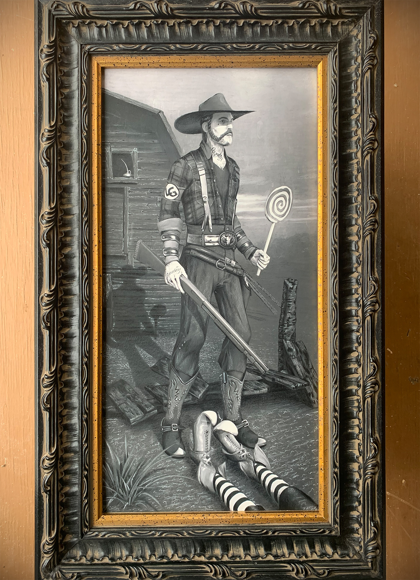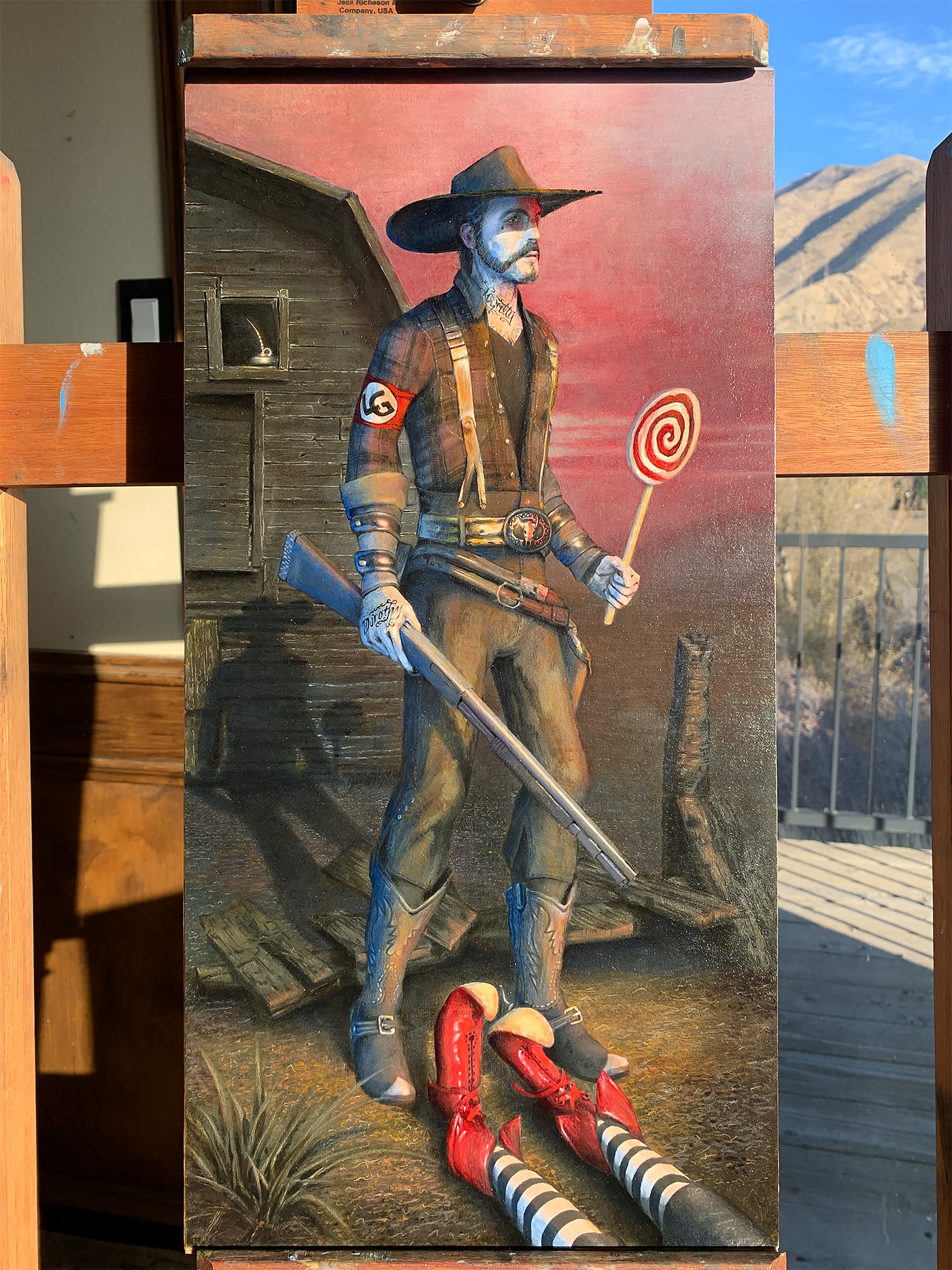 Hickory the farmhand from The Wizard of Oz is waiting with a shotgun in his right hand and a lollipop in his left. The shoulder patch indicates his allegiance to the Lollipop Guild. The oil can in the barn window reminds us that Hickory is the Tin Man in Oz. The Wicked Witch of the East with her ruby slippers and stockings was the one who turned the Woodsman to tin and why he lost his heart. Oil on Panel ( 10 x 20 inch Panel / 16 x 26 inch Frame) Waiting for Dorothy was on display as a part of the Wild Dreams of a New Beginning Exhibit February 26th – April 10th at Blue Line Arts in Roseville, CA.