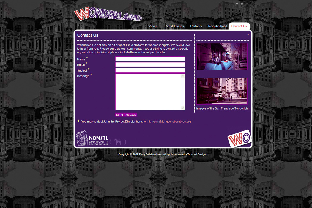 The Wonderland Logo and website were commissioned by Lance Fung of Fung Collaboratives for a group art installation on the streets of the Tenderloin in San Francisco, California. Working primarily in Dreamweaver I used HTML to create the functionality and look of this site. I also created the 17 blogs that accompany this web presence.